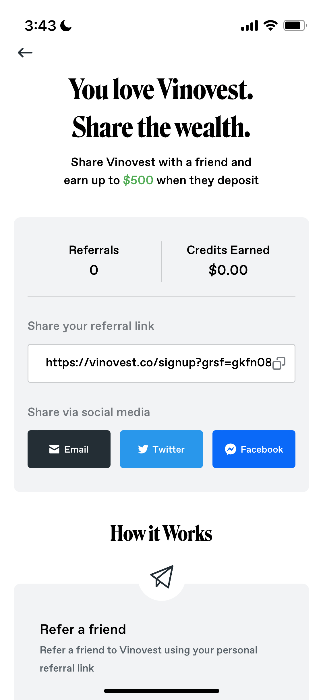 <div data-full-width="false"><figure><img src="https://2794996218-files.gitbook.io/~/files/v0/b/gitbook-x-prod.appspot.com/o/spaces%2F-LeklWo0yn03AhWro2Ux%2Fuploads%2Fnjr8Ee8l95PhxeeWOlfE%2FVinovest%20iOS%2001.png?alt=media&#x26;token=52709cd7-9d43-4231-93cb-be6db5035fb9" alt="" width="188"><figcaption><p>Using the GrowSurf API, you could show referral links to users in your mobile app</p></figcaption></figure></div>