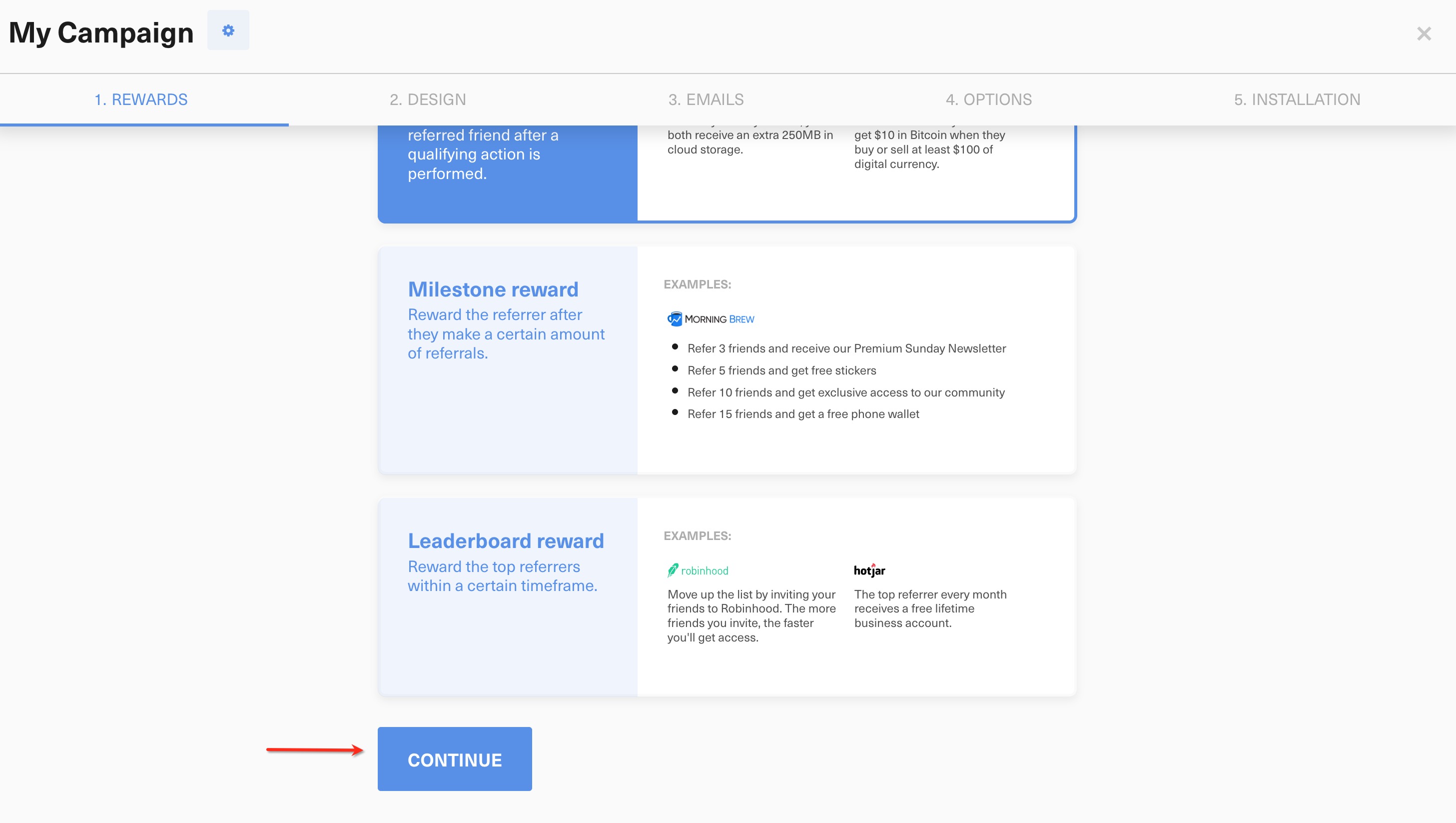**Step 5:** Navigate to the Rewards tab in the GrowSurf Campaign Editor, then click the *Continue* button.