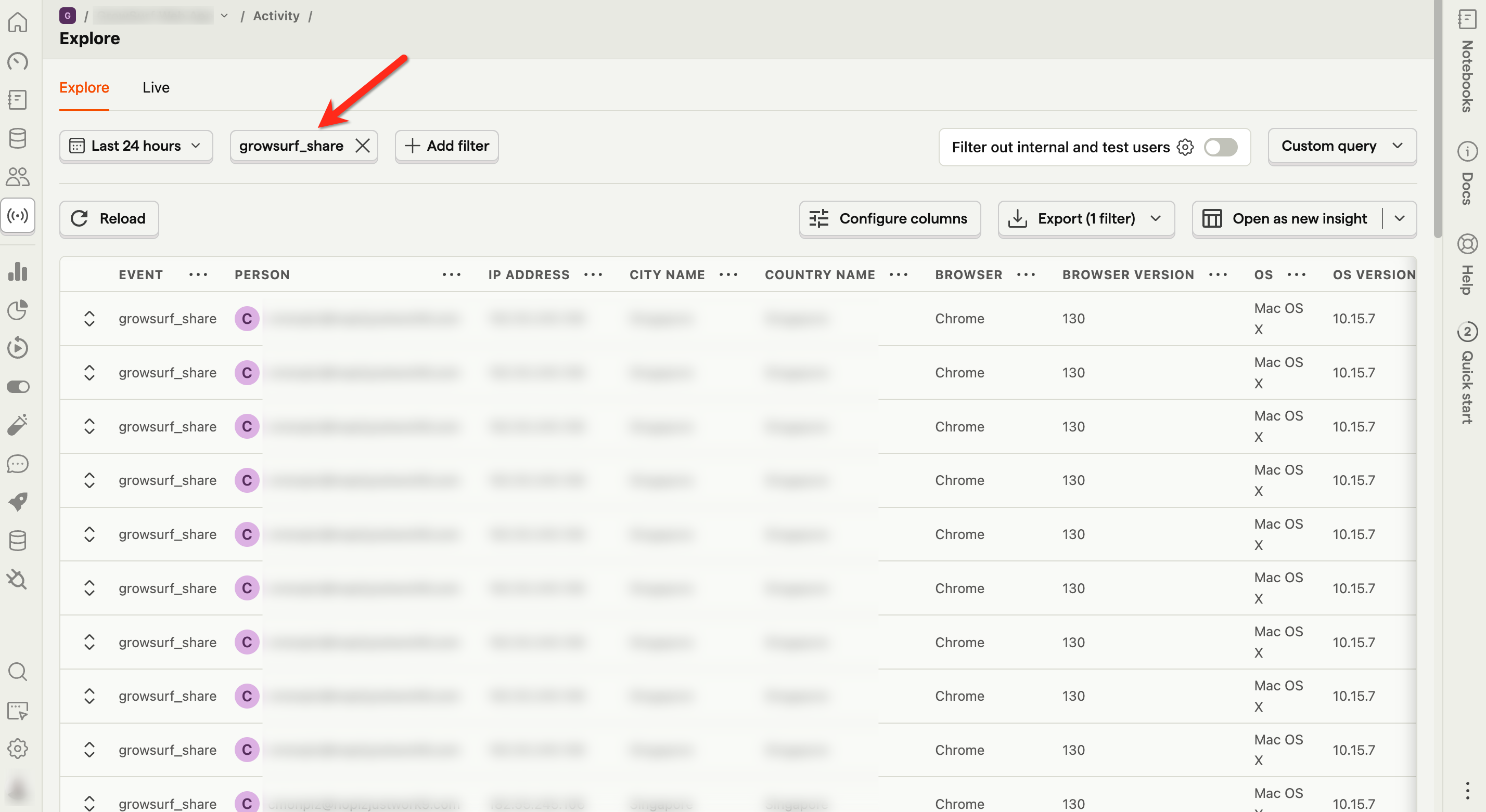 Once GrowSurf events get emitted, you will see them show up in *PostHog > Activity > Explore.*