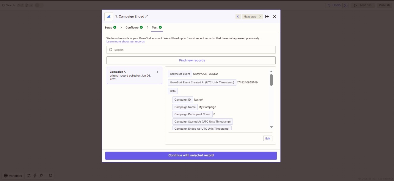 You have successfully configured the Zap to trigger once your GrowSurf campaign ends. The next step is to create the action of sending out an email.
