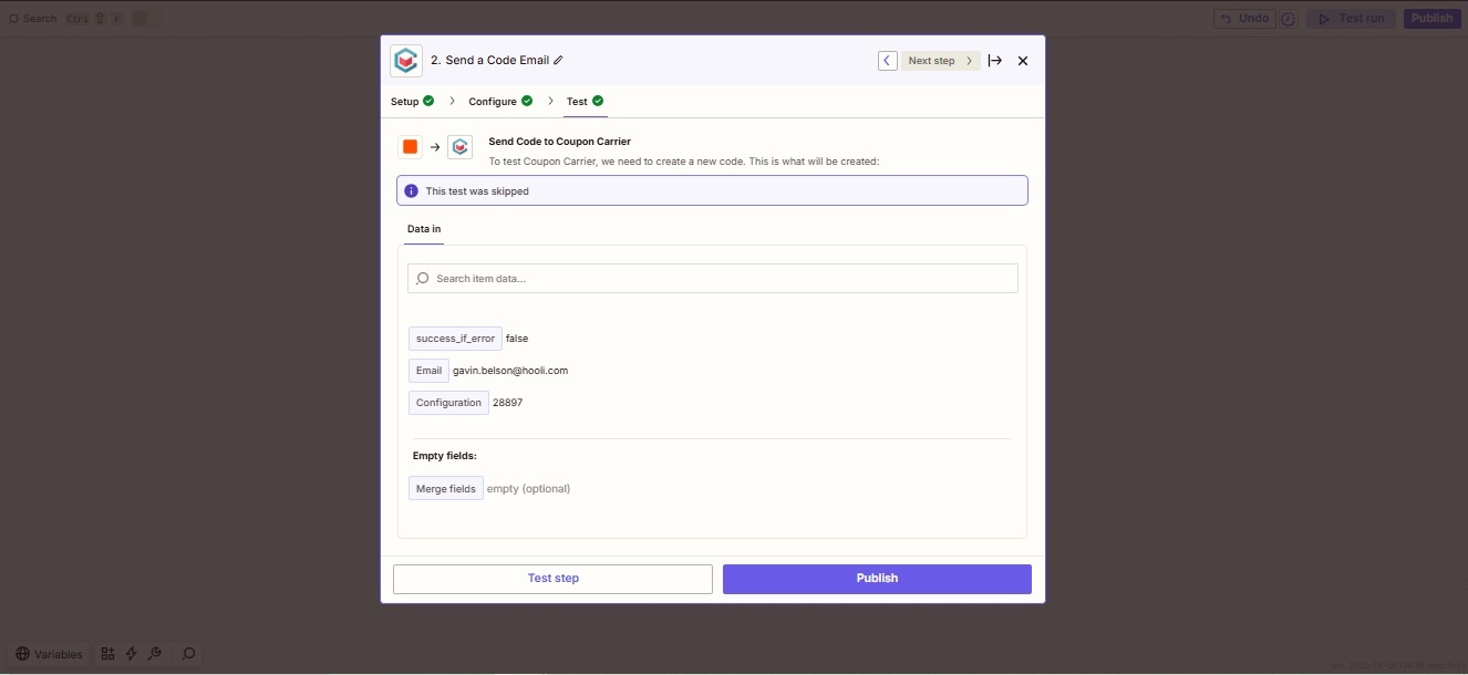 For the **Email Address** field, choose `Participant Email` from the dropdown menu. In the **Configuration** field, select the coupon email you want to trigger. Then, click **Continue**, followed by **Test step** to confirm it's working correctly.