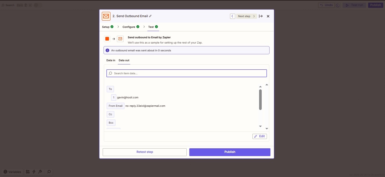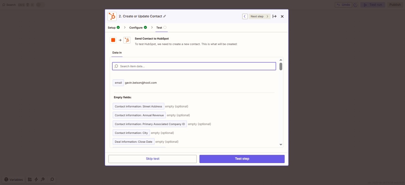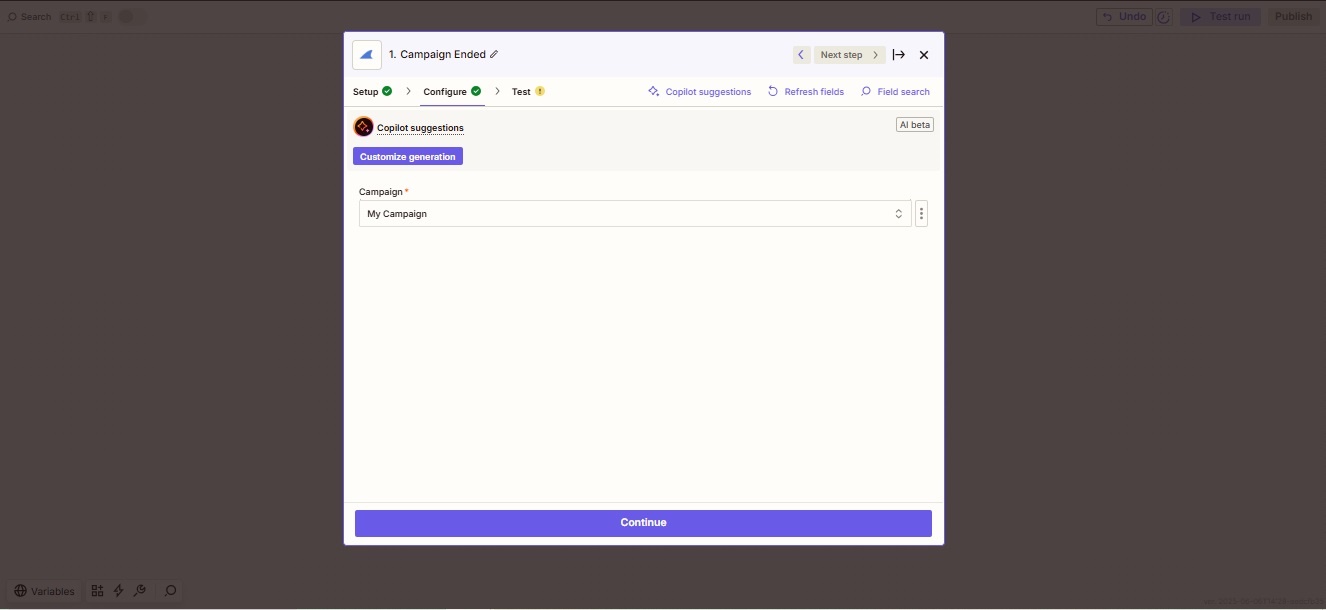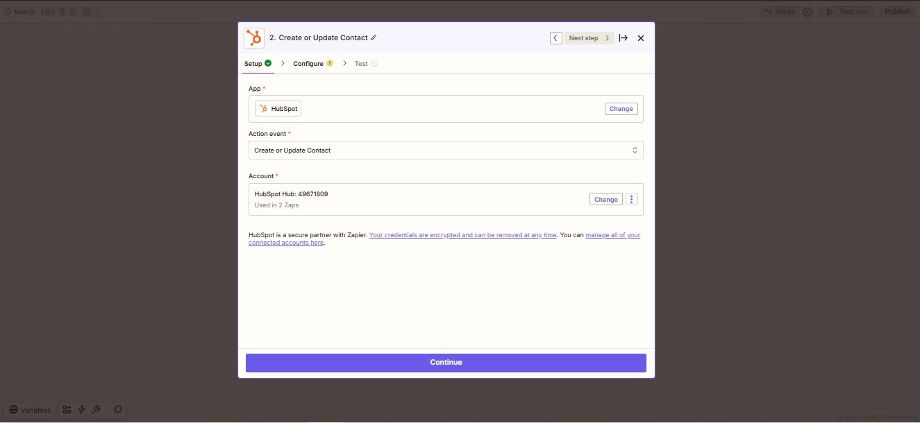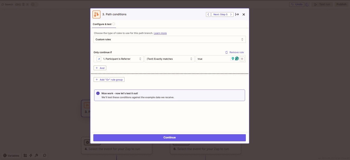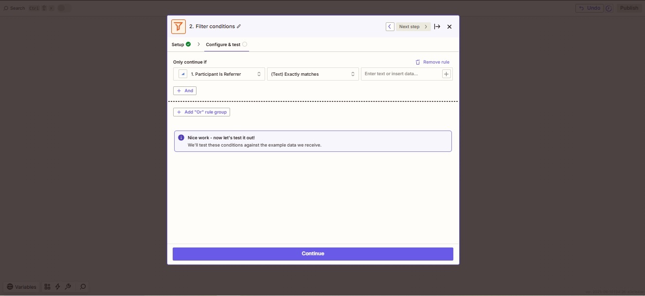 Then, click **Continue**, followed by **Test step** to confirm it's working correctly.