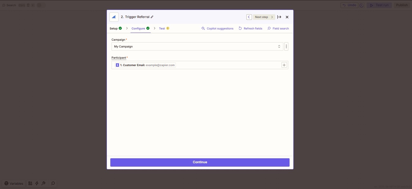 You've now successfully set up the Zap to trigger whenever a new participant is added to your GrowSurf campaign. Now it's time to create the action of adding/updating the new GrowSurf participant.