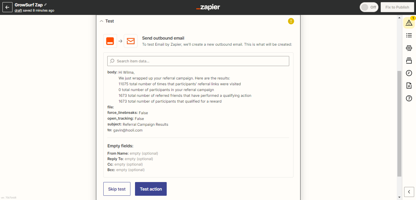 You've now successfully set up the Zap action. To finalize the process, simply click the **Publish** button. Your Zap is now live and will send out an email report when your GrowSurf campaign ends.