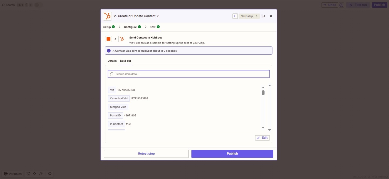 You've now successfully set up the Zap action. To finalize the process, simply click the **Publish** button. Your Zap is now live and will create/update new HubSpot contacts whenever a new GrowSurf participant is added.