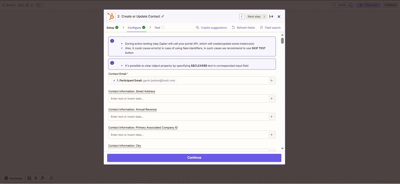 Then select **Participant Email** from the dropdown menu in the **Contact Email** field. Once you've filled in all the properties that you want to save to the HubSpot contact, click **Continue.**