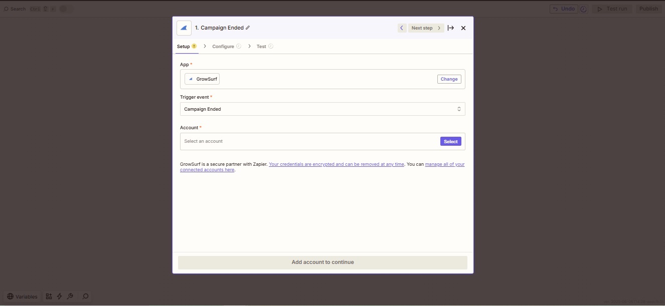 &#x20;In the **Trigger Event** field, choose **Campaign Ended**. Then, in the **Account** field, select your connected GrowSurf account, or click **Connect a new account** to link a new one. Next, click **Continue**.